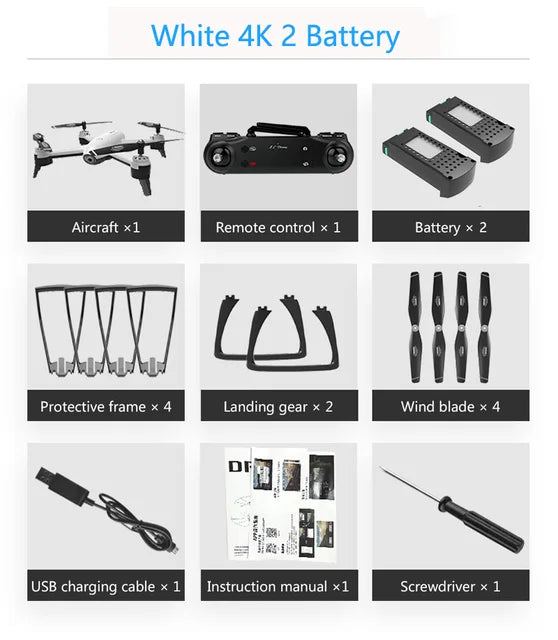 Specification:- Material: ABS - Color: Black, White (Optional) - Frequency: 2.4G - Channel: 4CH - Gyro: 6Axis - Camera: 4K - Photo: 4096*3072 - Video: 2048*1080 - Quadcopter Battery: 3.7V 1600mAh Lipo Battery (Included) - Transmitter Battery: 2 x AAA Battery (Not Included) - Flying Time: About 22mins - Charging Time: About 150-180mins - R/C Distance: About 100m - Quadcopter Size: 27x27x 7cm (without protection cover) - 32x32x 7cm (with protection cover) - Drone weight: 140.6g - Package Size: 33.5x 21x 8.6cm