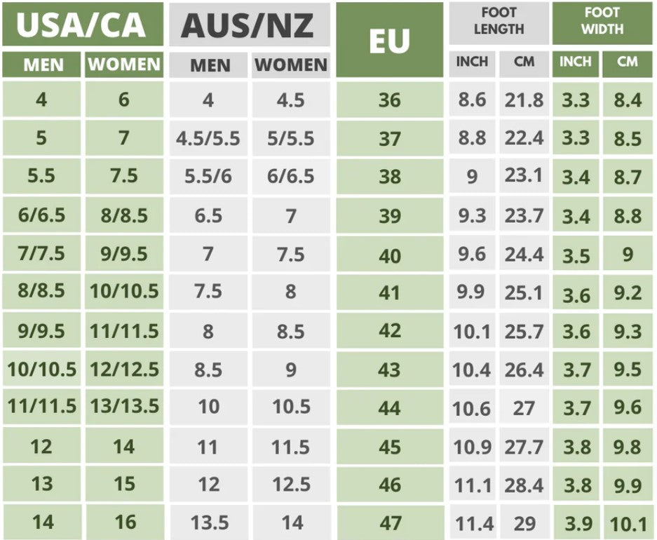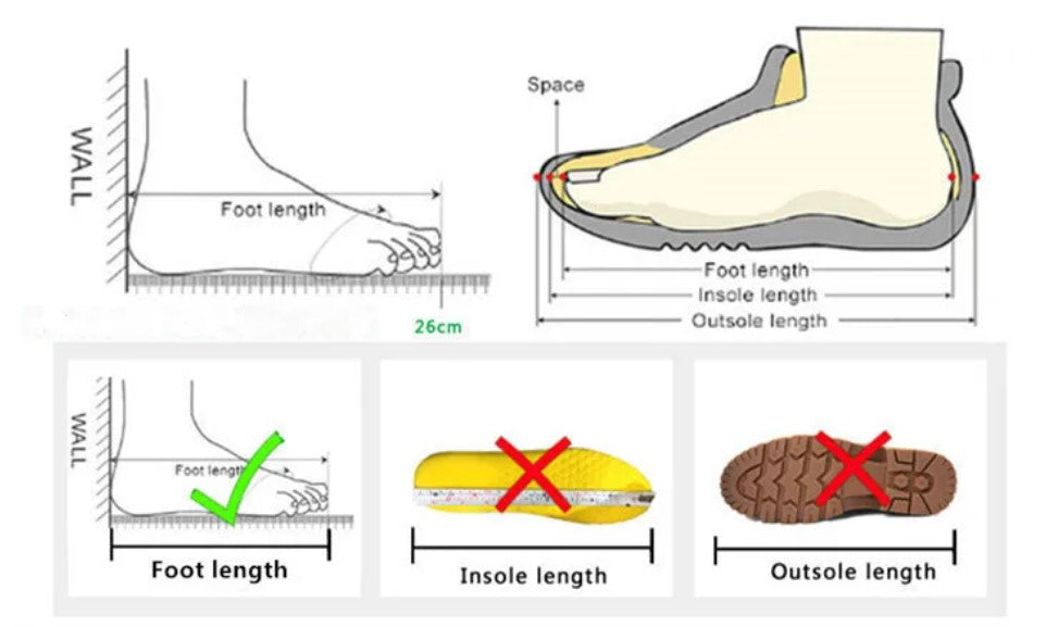 Sizing Note:1. Foot length is not insole length 2. Foot length is not outsole length 3. Please do not measure the insole length or outsole length of your shoes, it is different from the foot length 4. Measure your foot by the above photo 5. Find the equivalent "EU/US/CN/NZ/AUS" size from the size chart by your foot length 6. If you do not know how to choose the size, please feel free to contact us!